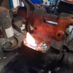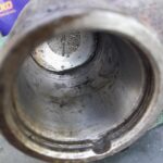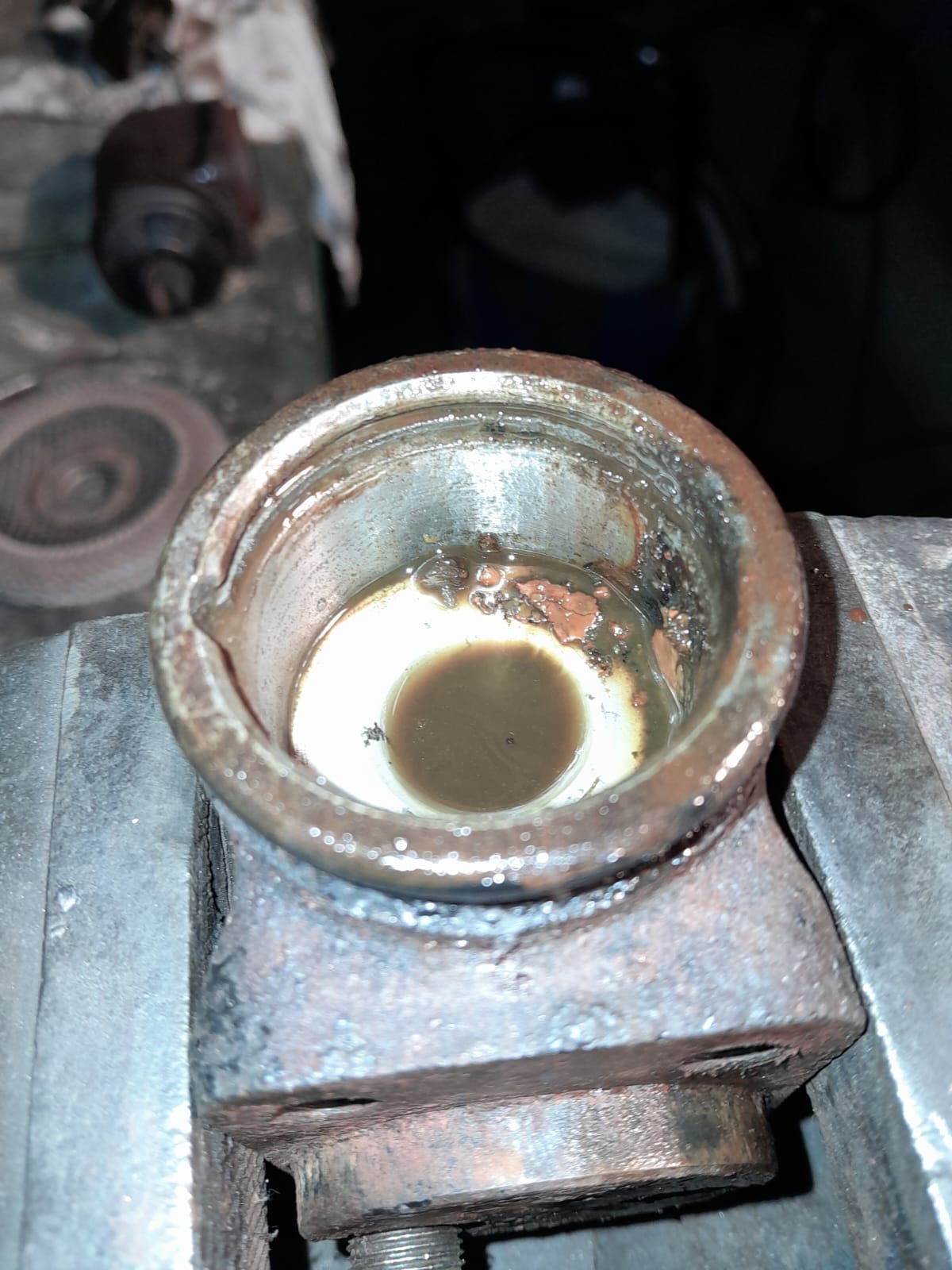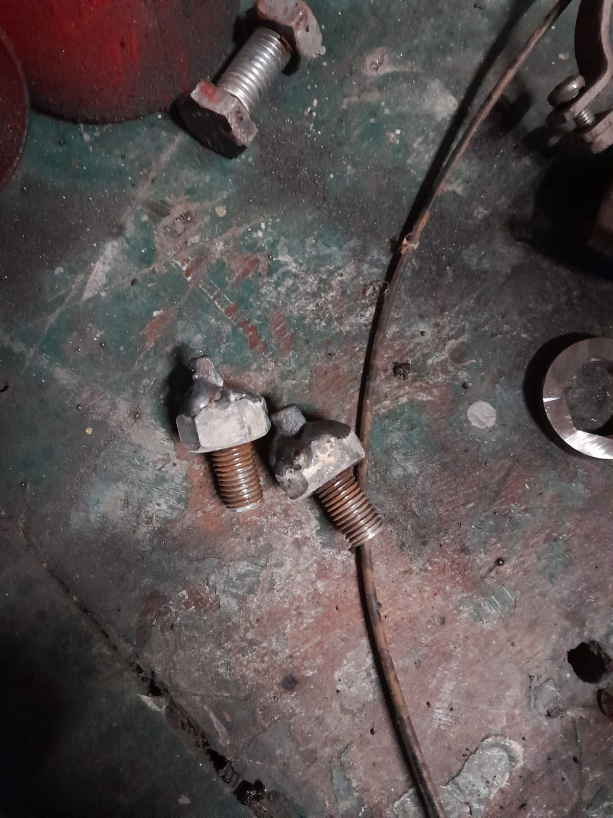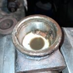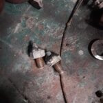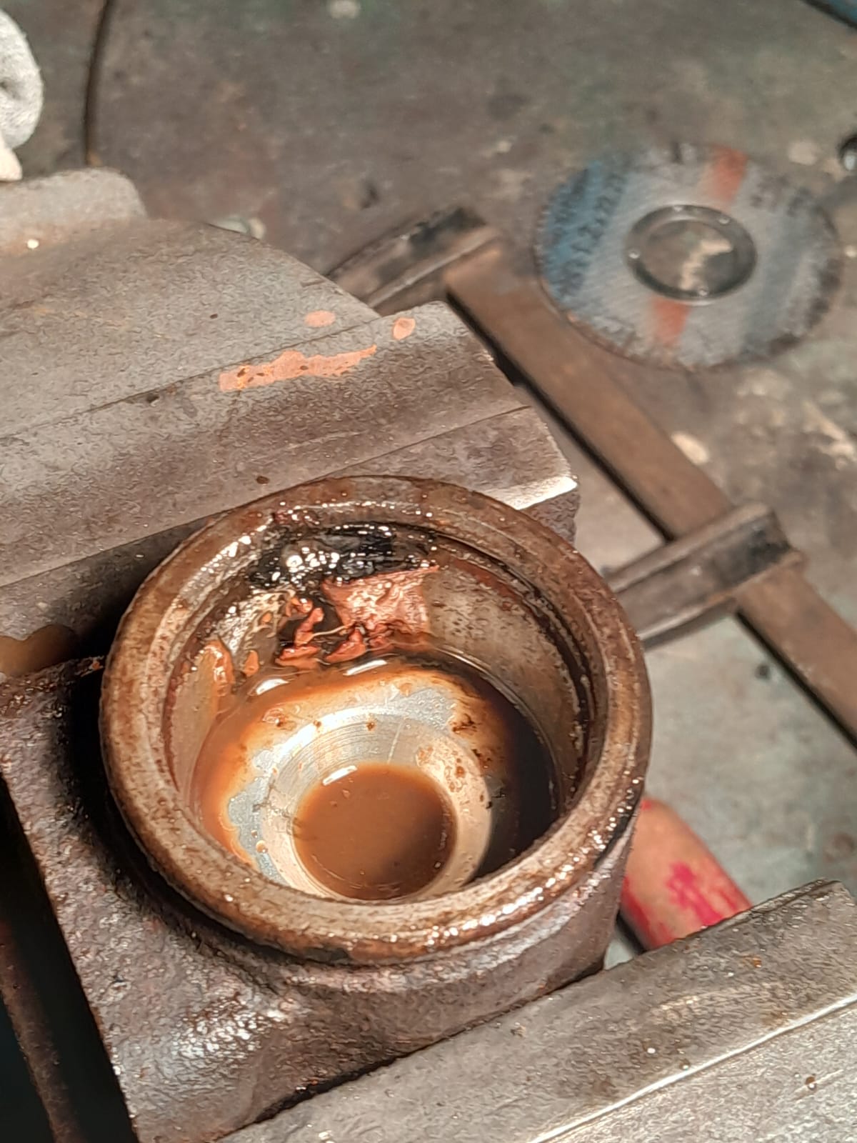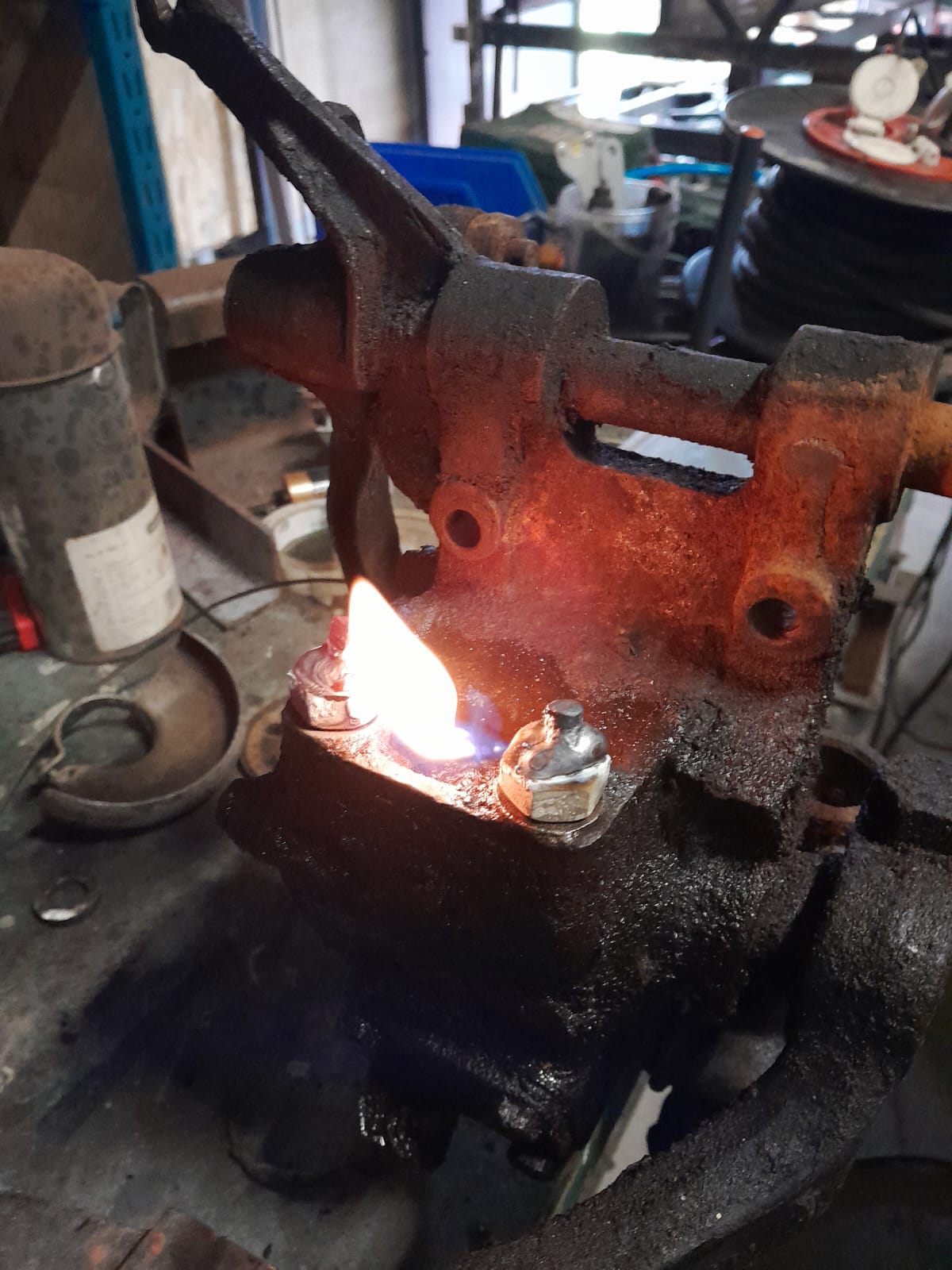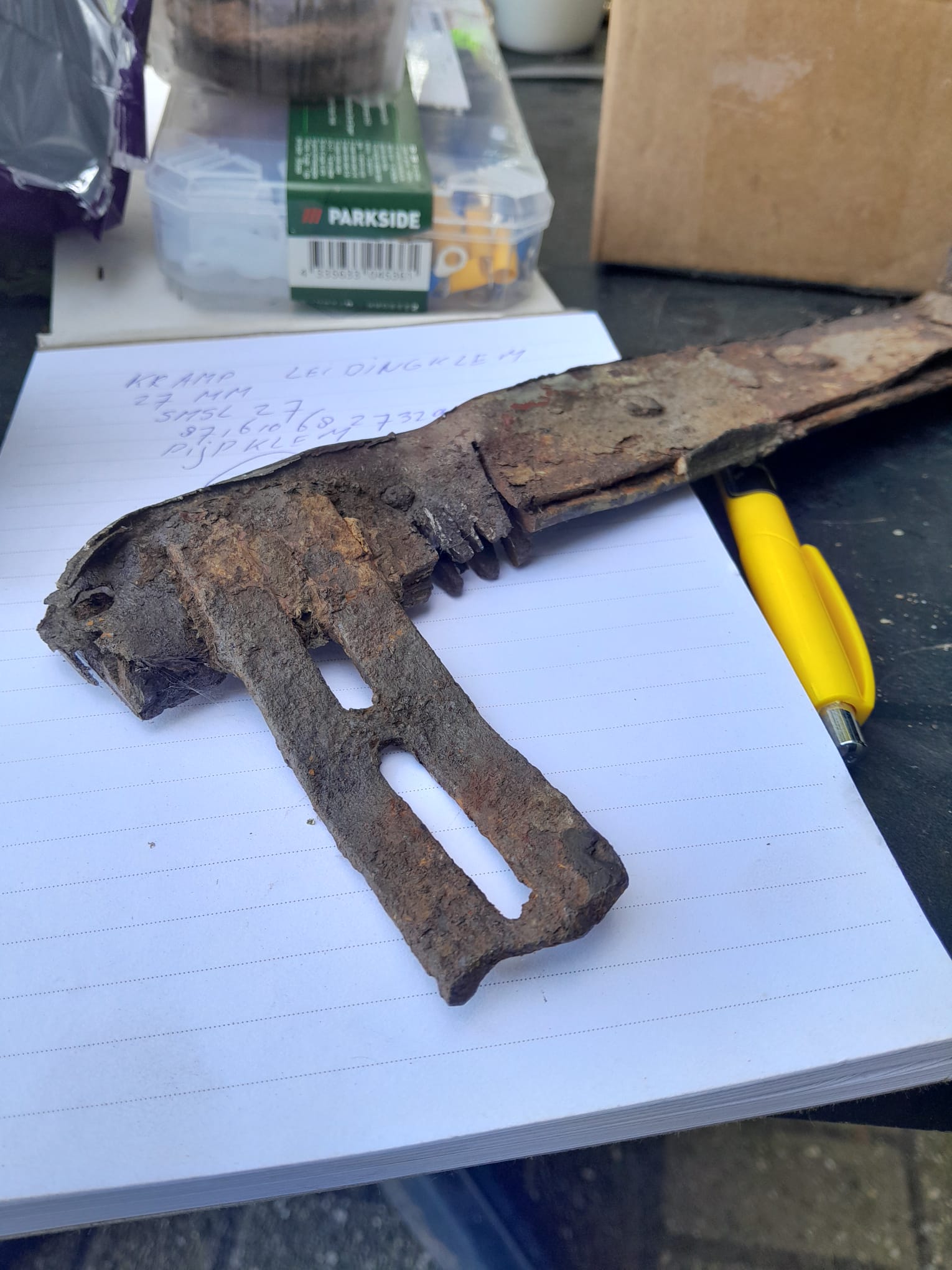 (1) (2) Veerhand in de bankschroef om restanten van de veerpen uit de gaten te persen. (3) Veerhand zonder veerpen en restanten (4) de veerpen in stukken..