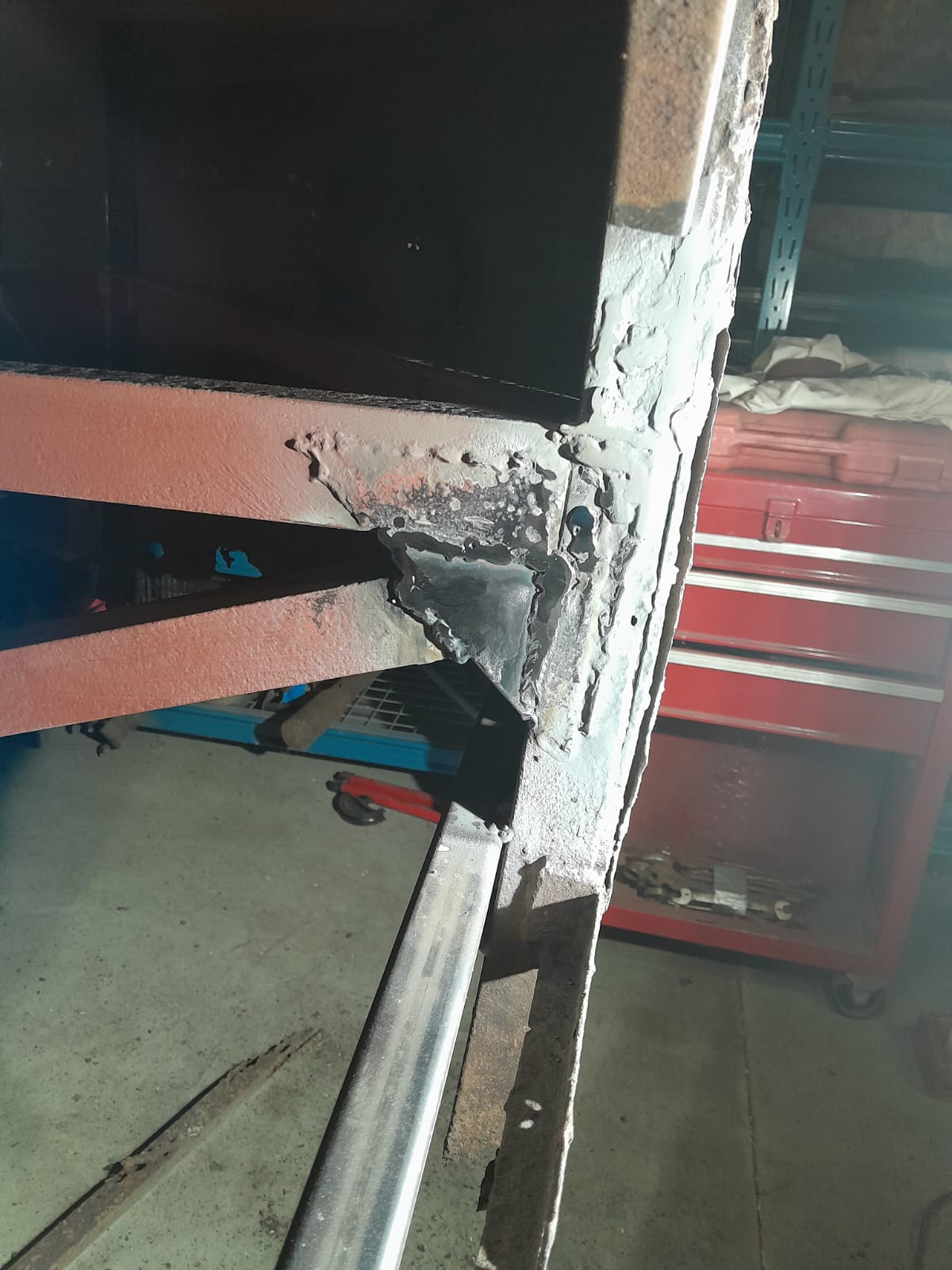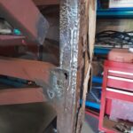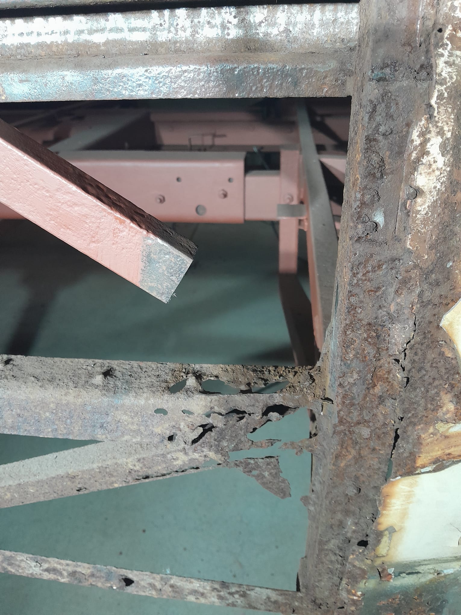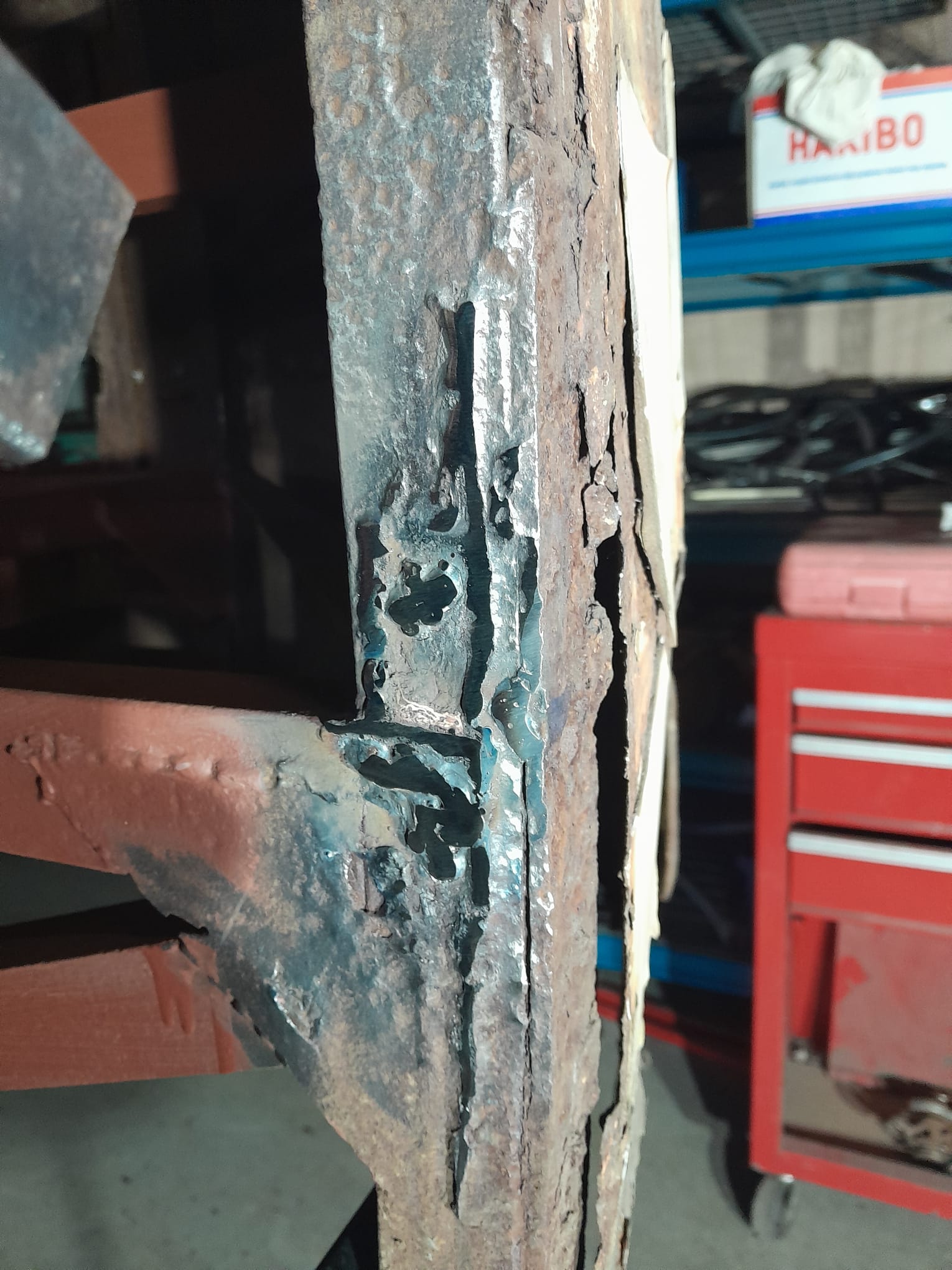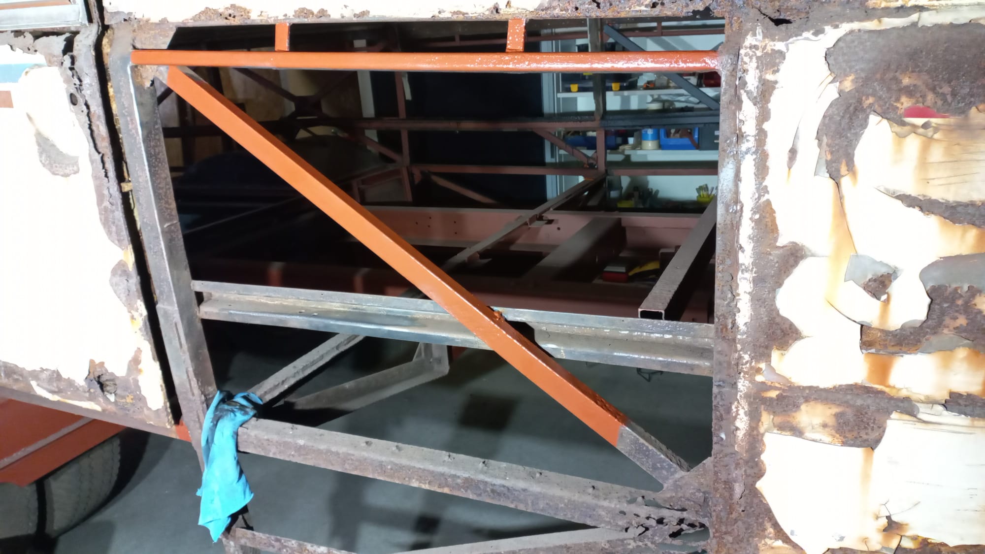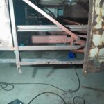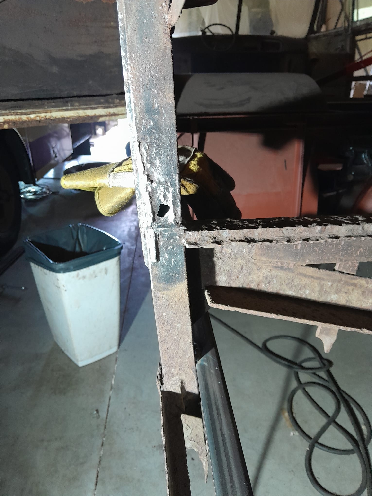 Teneinde verder te kunnen werken aan het chassis van het paarse exemplaar, in het bijzonder aan de onderzijde, was het voornemen om dat chassis op zijn kop te leggen. Daarvoor moest de achteras worden gedemonteerd. Dat ging best vlot totdat één van de veerpennen dermate vast zat dat deze op geen enkele wijze van zijn plek wilde. Deze veerpen verbindt het oog van de bladveer(opgerold deel van de bladveer aan het uiteinde) met gaten in de veerhand (die zit aan het chassis vast met klinknagels). Vervolgens is de achteras compleet met veerhand losgehaald. Daarna zijn nieuwe pogingen gedaan om de veerpen te verwijderen. Uiteindelijk is deze verwijderd door deze in stukken te zagen met een slijpschijf….. Met behulp van de motortakel is uiteindelijk het chassis op zijn kop gedraaid.