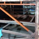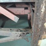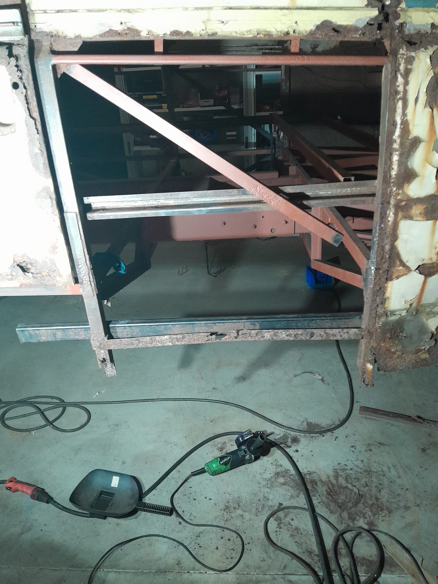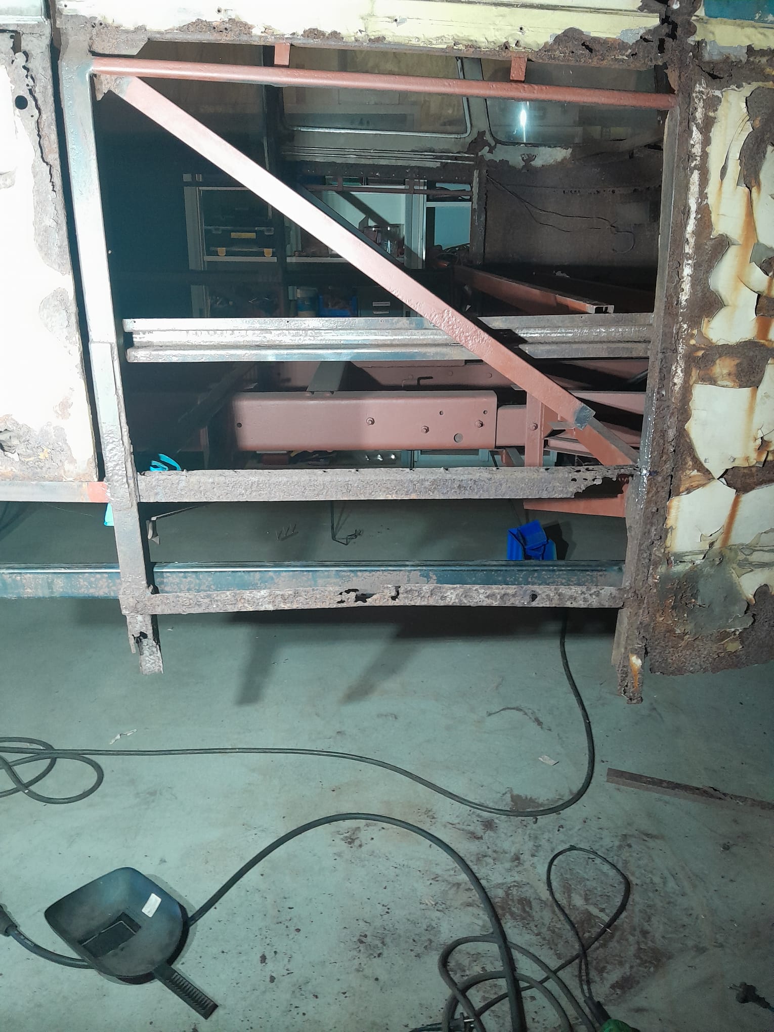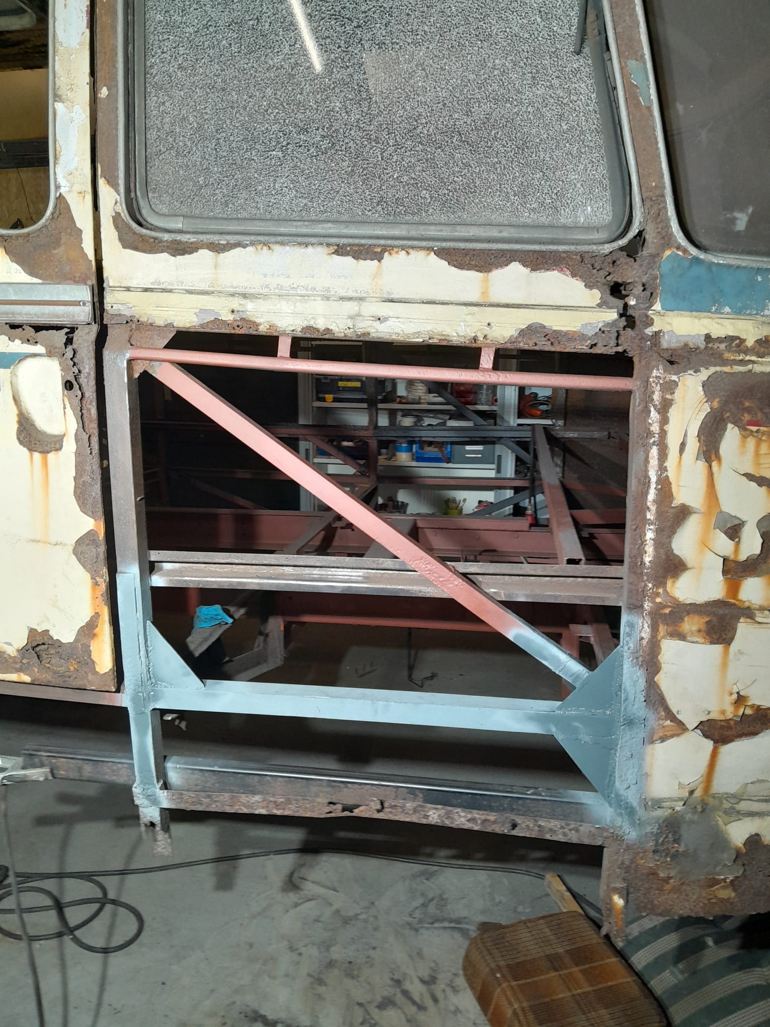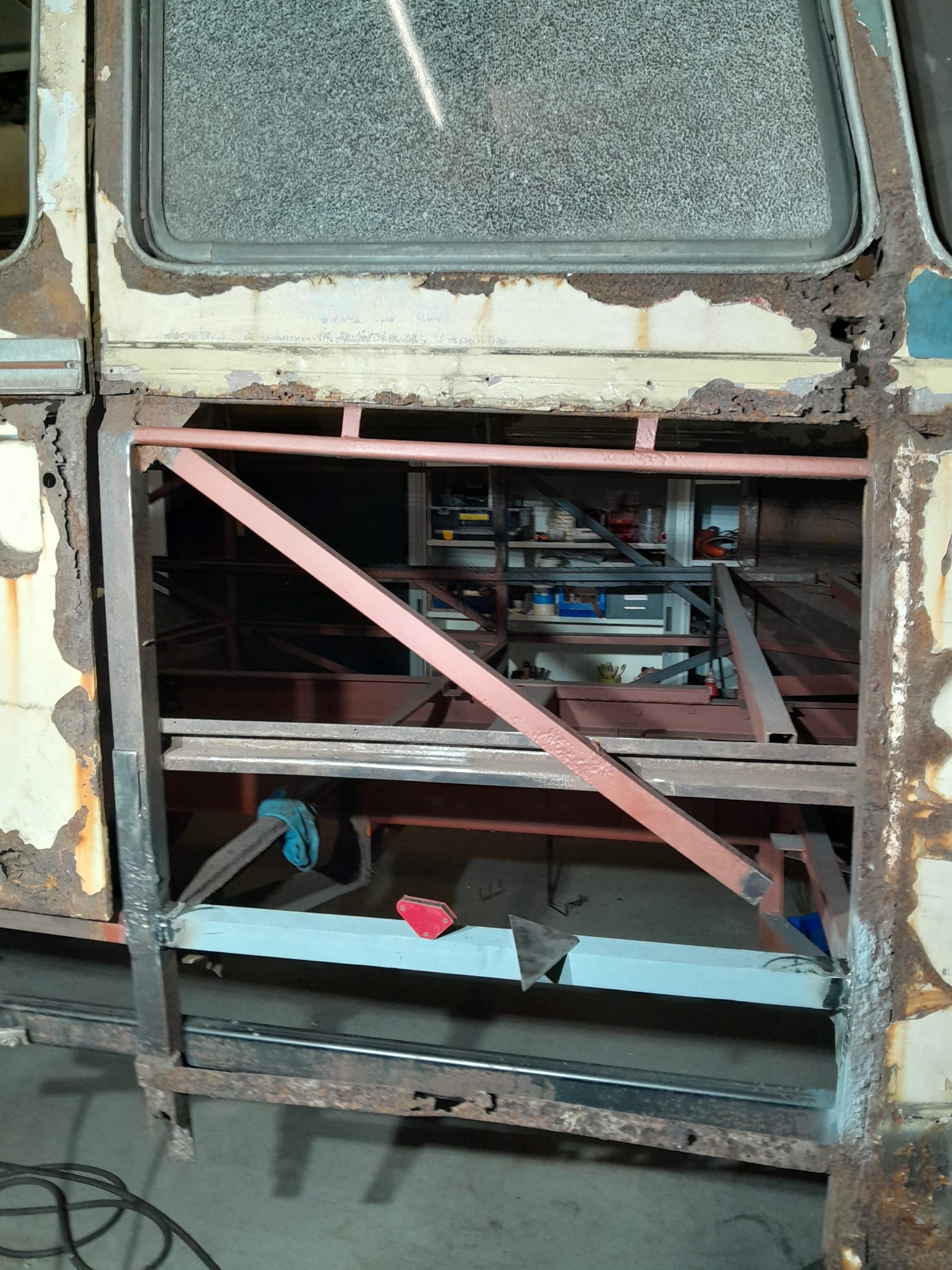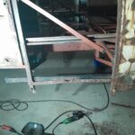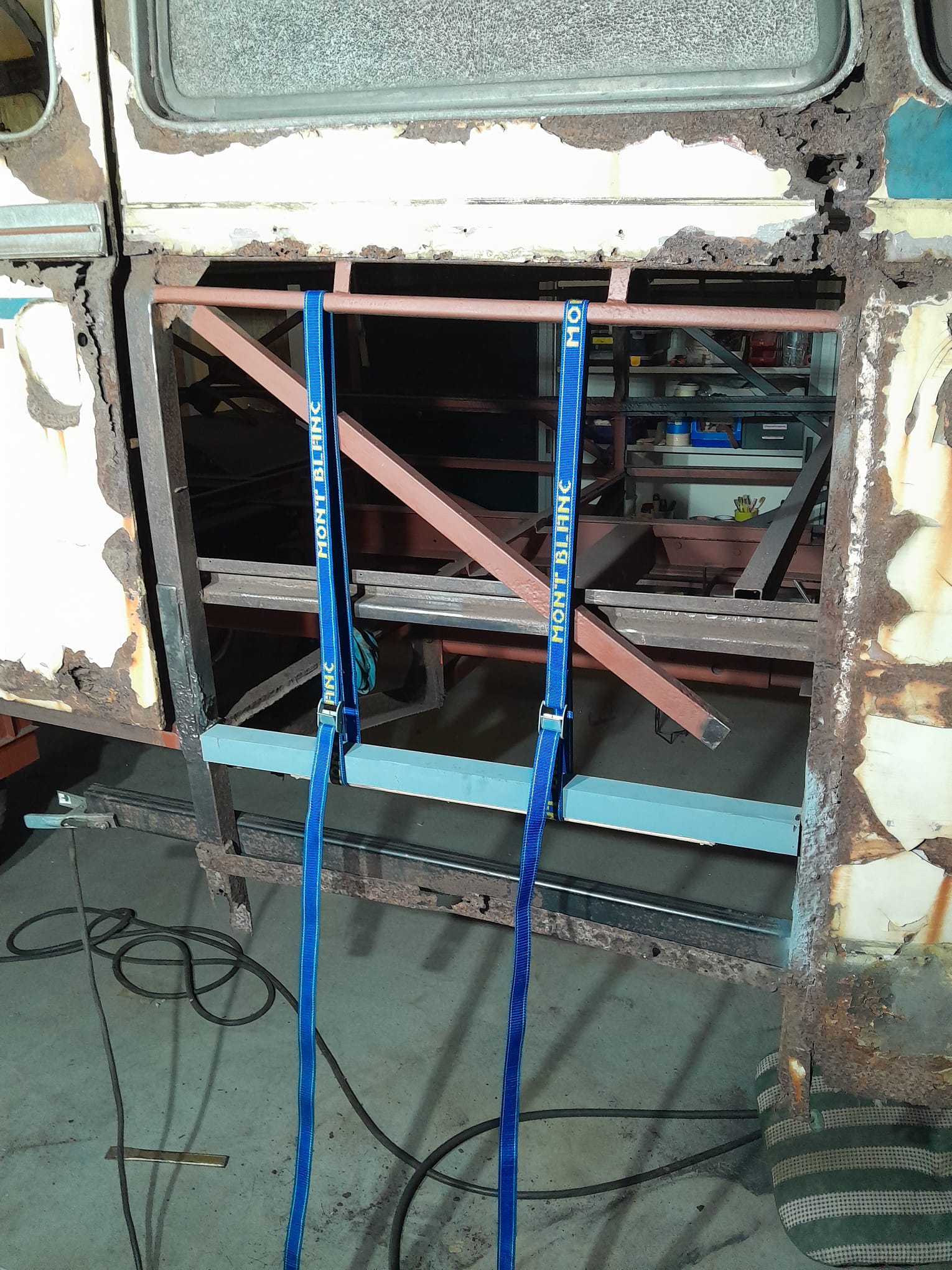 Teneinde verder te kunnen werken aan het chassis van het paarse exemplaar, in het bijzonder aan de onderzijde, was het voornemen om dat chassis op zijn kop te leggen. Daarvoor moest de achteras worden gedemonteerd. Dat ging best vlot totdat één van de veerpennen dermate vast zat dat deze op geen enkele wijze van zijn plek wilde. Deze veerpen verbindt het oog van de bladveer(opgerold deel van de bladveer aan het uiteinde) met gaten in de veerhand (die zit aan het chassis vast met klinknagels). Vervolgens is de achteras compleet met veerhand losgehaald. Daarna zijn nieuwe pogingen gedaan om de veerpen te verwijderen. Uiteindelijk is deze verwijderd door deze in stukken te zagen met een slijpschijf….. Met behulp van de motortakel is uiteindelijk het chassis op zijn kop gedraaid.