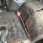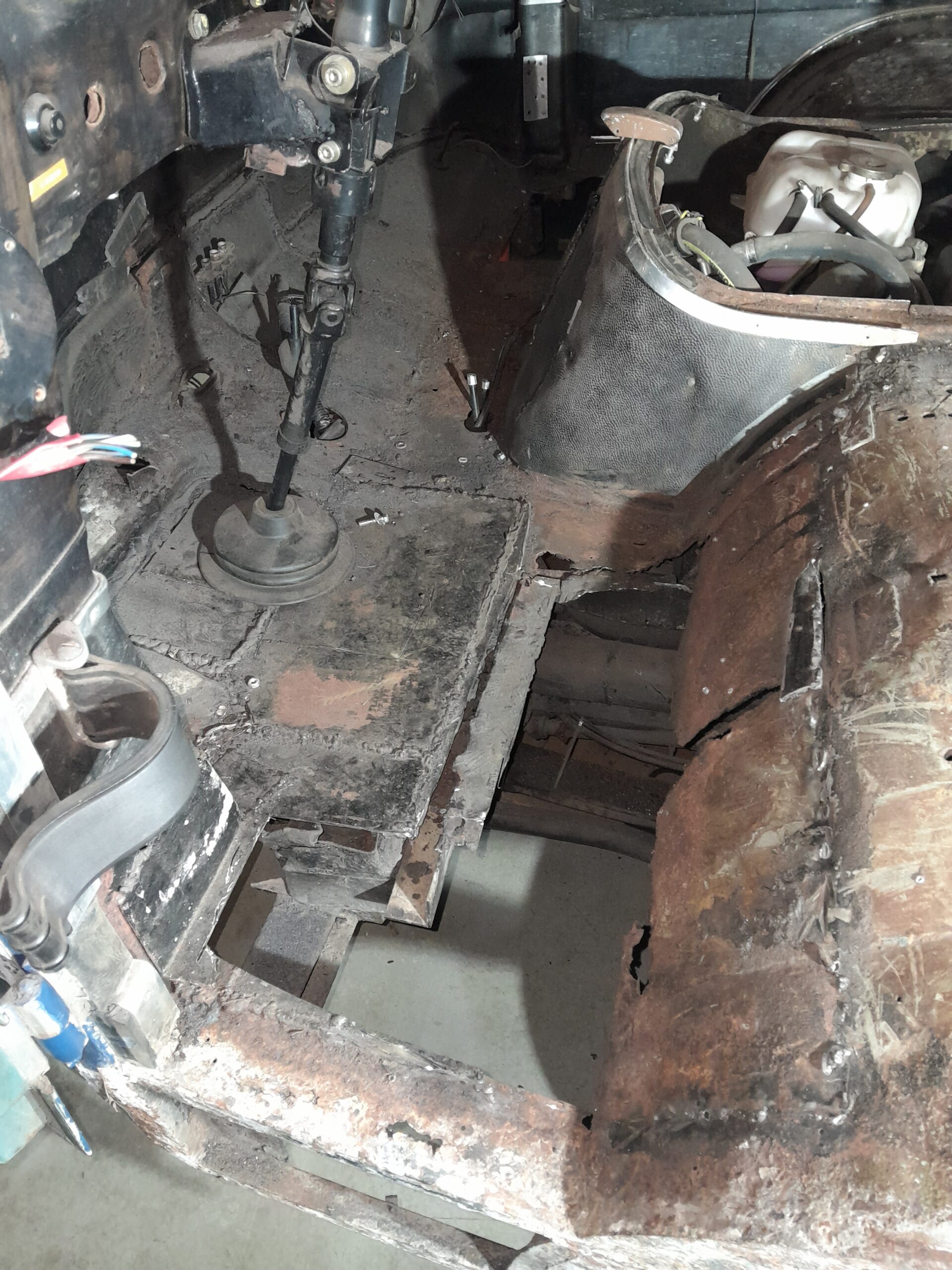 Ook aan de cabine van het blauwe exemplaar is één en ander gedaan. De niet originele stuurkolom en handremmechanisme zijn verwijderd. De vloer van de cabine is “gerepareerd” door platen over verroeste platen aan te brengen. Uiteraard komt dat niet door onze kwaliteitscontrole dus zijn c.q. worden deze platen verwijderd om er alsnog nieuwe platen in te lassen zoals het hoort.