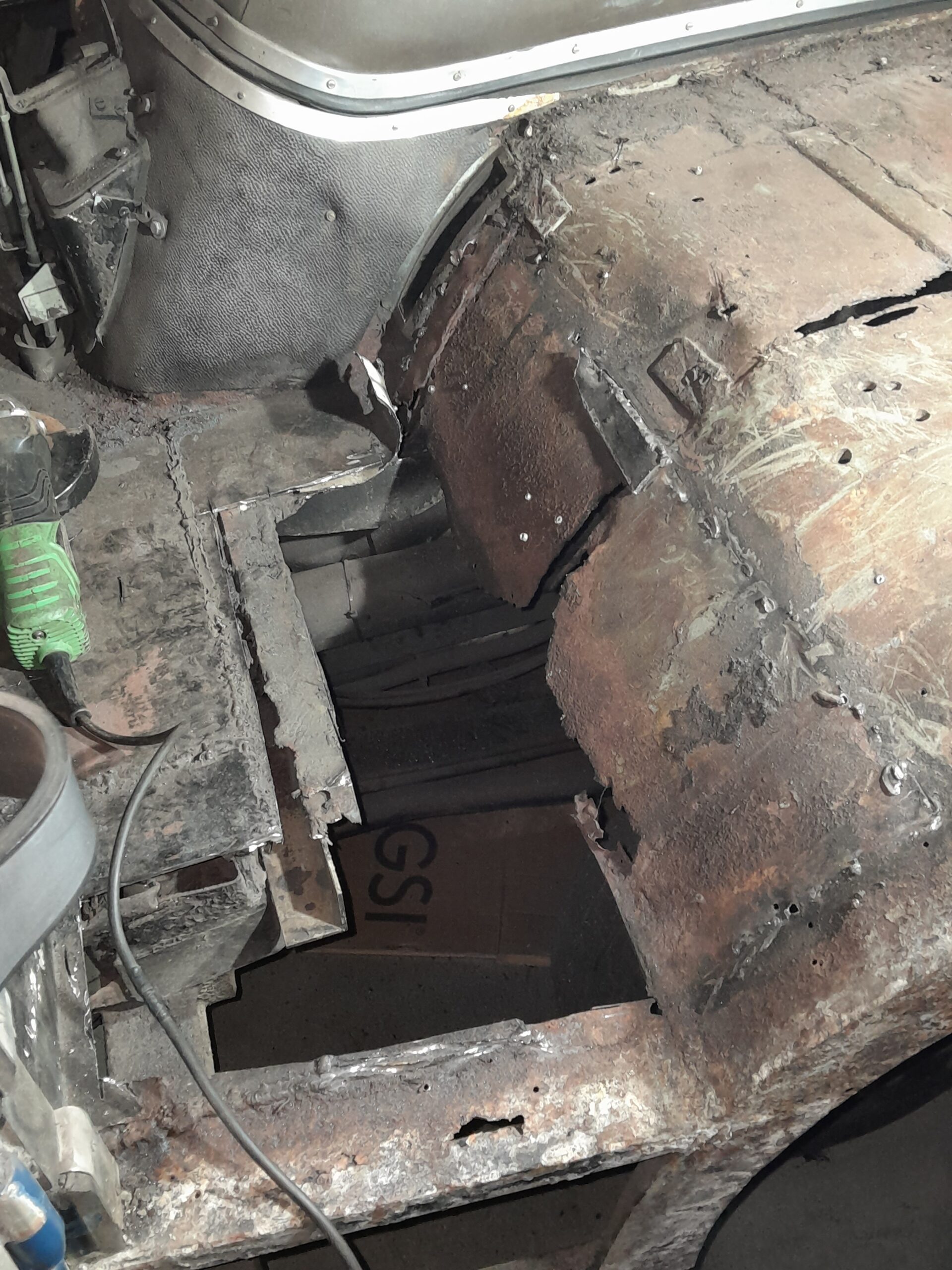 Van de cabinevloer blijft niet veel over. Ook hier plaatwerk over plaatwerk.