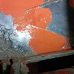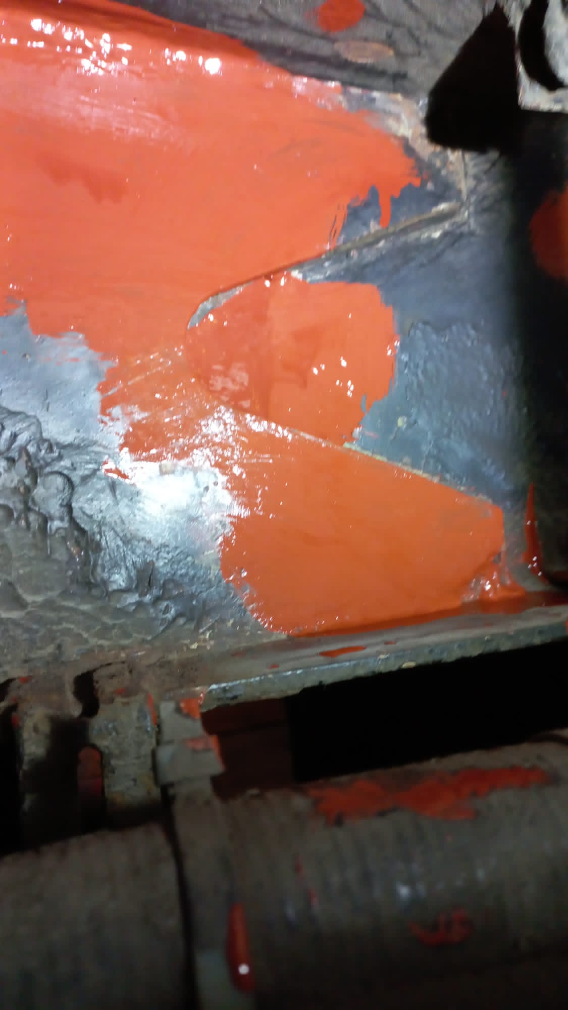 (1) chassisbalk in de zinkspray (2) op andere plek roest verwijderd en in de menie (3) dwarsbalk in de menie