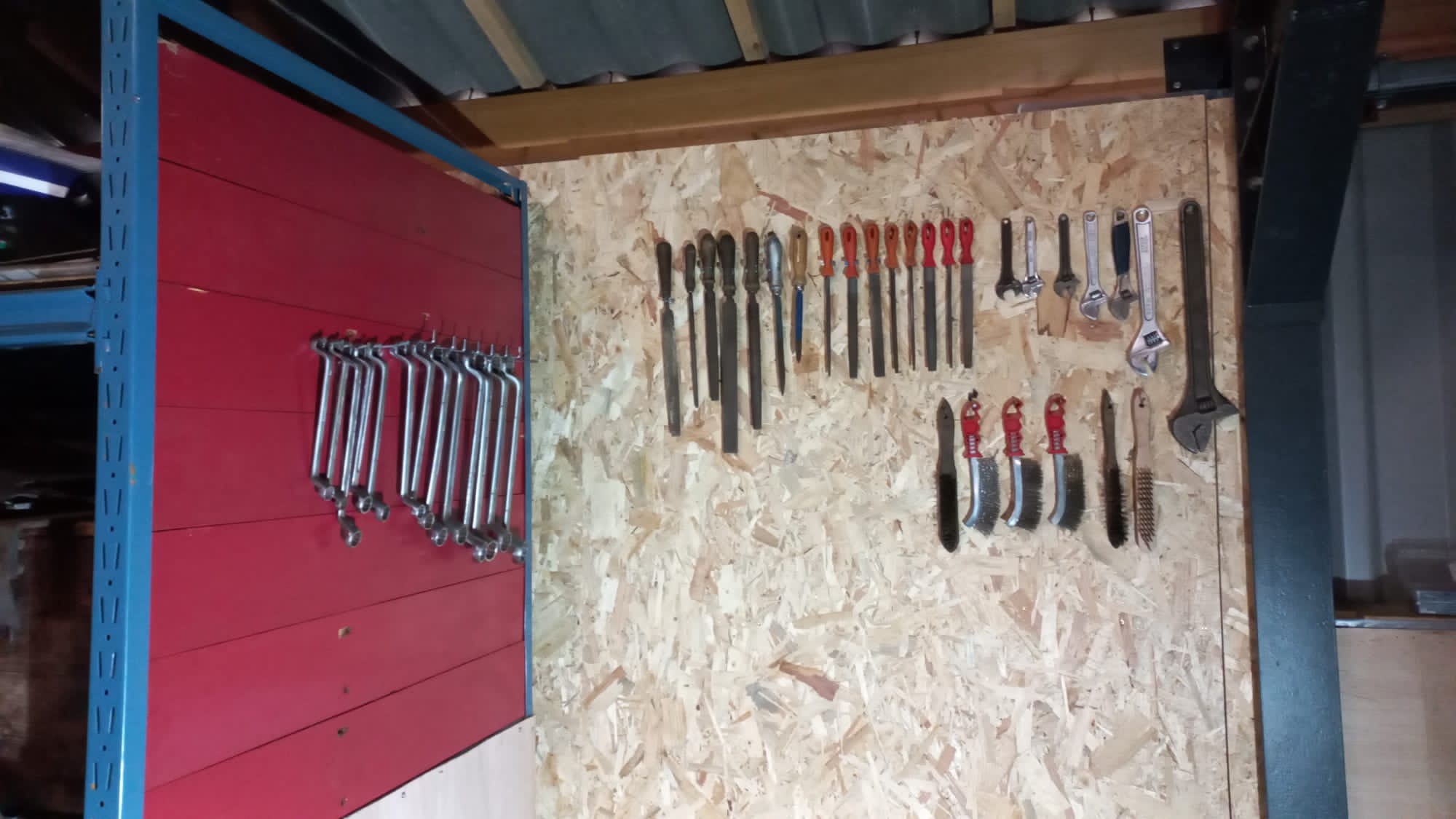 Daar doen we inmiddels ook aan. Van een hekwerk werd aan de zijkant van een stellingkast een rek gemaakt waaraan gereedschap kan worden opgehangen. De vraag is en blijft natuurlijk of gebruikt gereedschap dan weer op zijn (goede) plek wordt terug gehangen…